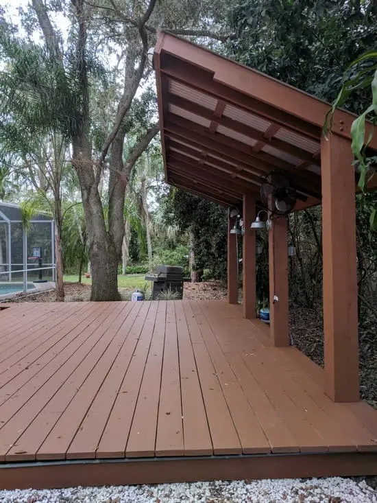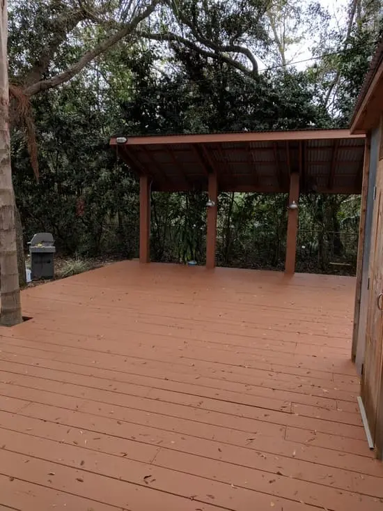 Weathered deck. Pressure washed. Mechanically sanded. Cleaned. Applied 2 coats of Sherwin Williams SuperDeck IR Reflective Semi-Solid Waterborne Stain.